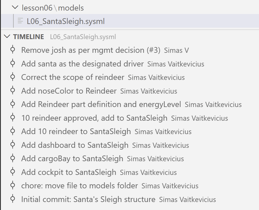 5. Open the Timeline view at the bottom of Explorer and click on your first commit to see how the model has evolved.