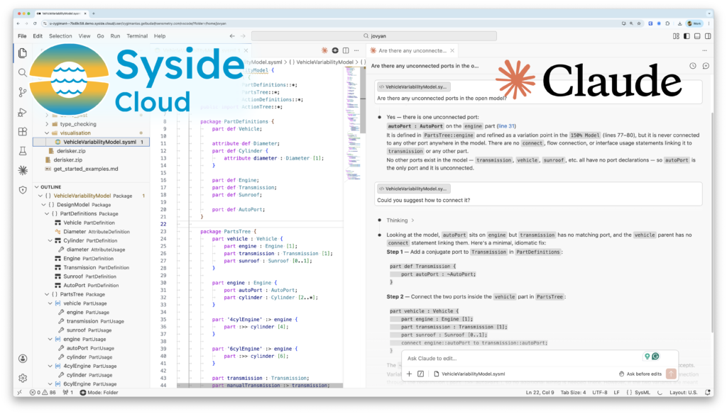 Gerd Wagner, book author, consultant, trainer and professor, notes: “Syside Cloud allows using the tools without installing any software on the course participants' computers. This is essential because it is often not possible to install training software on enterprise computers”. By meeting engineers in the familiar territory of the modern developer stack, the suite eliminates the resistance often found in legacy tool adoption. Dr. Wagner further adds: “Syside Modeler is a mature textual modeling tool that engineers feel comfortable with since they are already familiar with environments like VS Code”. Beyond familiarity, the environment allows users to leverage Claude AI, making SysML v2 easier to pick up. Explain an error? Generate an example? Walk you through an unfamiliar construct? In Syside Modeler (part of Syside Cloud) AI can do all that in the same window where you model.