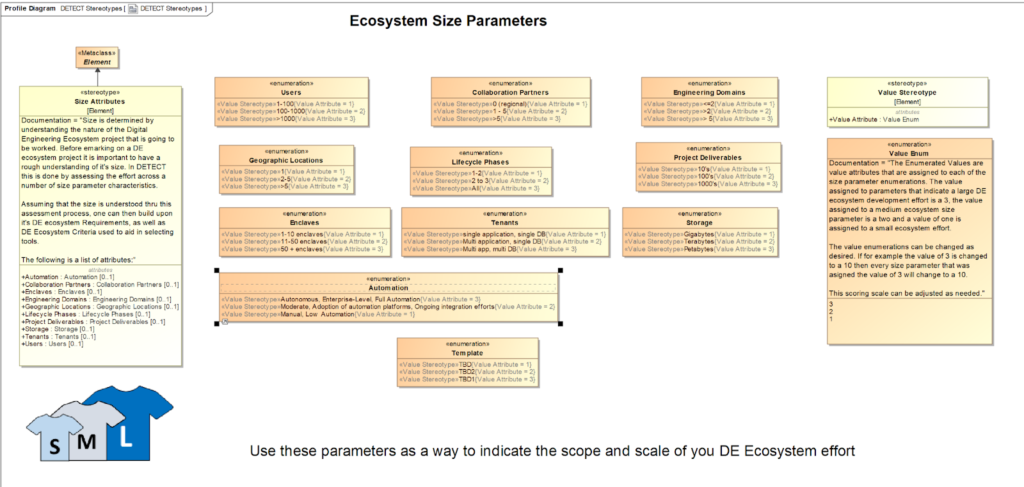 Item usage, named inputs, is further composed of enumerated attributes (e.g., number_of_users, engineering_domains, tenants) that the user must ingest into the model to determine the size of the DE ecosystem. This expression differs from the original SysML v1 DETECT model, in which user inputs were treated as requirements rather than attributes. At Sensmetry, the decision was made to convert them to semantically distinct expressions because the text bodies of each input were formulated as questions rather than “shall” statements, and because the documentation for each input explicitly referred to “this parameter”. If a new genuine need emerges, a user may add or tailor the requirements for the DE ecosystem inputs. The values of attributes are distinct enumerations that represent selectable user choices and provide 1-3 range values for DE ecosystem size calculation, with a default value of ‘TBD’. Every attribute usage needs to be redefined, as they are primarily defined within the DETECT_Inputs part definition.