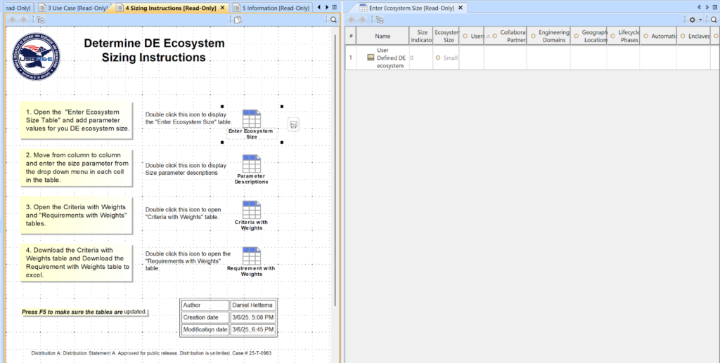 In March 2025, the U.S. Office of the Under Secretary of War, Research and Engineering (OUSW(R&E)) provided the Digital Engineering Tool Evaluation Criteria Template (DETECT) tool on the Digital Engineering Body of Knowledge (DEBoK) website. The tool offered a solution for specifying Digital Engineering Ecosystem Requirements and Digital Engineering Ecosystem tool evaluation criteria based on an estimation of the Digital Engineering Ecosystem size being developed, but it also came with accessibility-related downsides, which have been addressed by building the DETECT solution using SysML v2 & the Syside tool suite