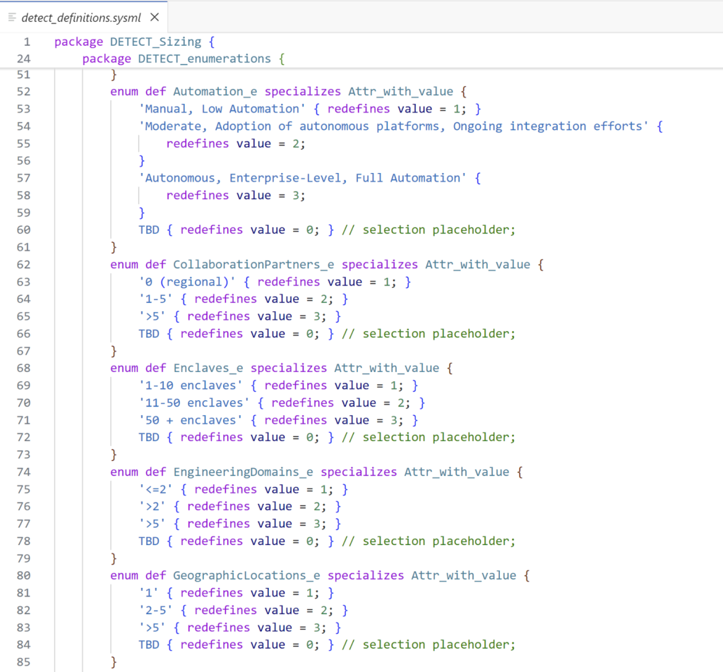 During the conversion of DETECT use cases, user inputs, and other usage artifacts, the DETECT model definitions have been added simultaneously to a SysML v2 file. The file detect_definitions.sysml contains the DETECT_Sizing package, which includes all model definitions and several model usages. It is composed of a part definition DE_Ecosystem, which defines any DE ecosystem and nests item usage inputs, the derived attribute usages system_size_number, and system_size. Each input attribute, such as number_of_users, consists of a documentation Question and a documentation Description, equivalent to the requirement name and documentation property in SysML v1. Each attribute also has alias names (Q1, Q2, etc.), represented by ‘<>’ symbols, and defined by enumeration definitions unique to each input. Note that at the time of the DETECT model migration from SysML v1 to v2, the Q7 job_series was not yet implemented in SysML v1; hence, its documentation is marked ‘TBD’.