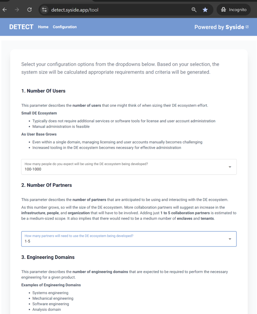 A web application makes DETECT accessible to all users by removing the need for direct contact with the underlying SysML v2 system model. The tool features a clean, intuitive interface that lets users select the input parameters that best describe their project. From there, the DE ecosystem size, relevant requirements, and the criteria weights are automatically calculated.